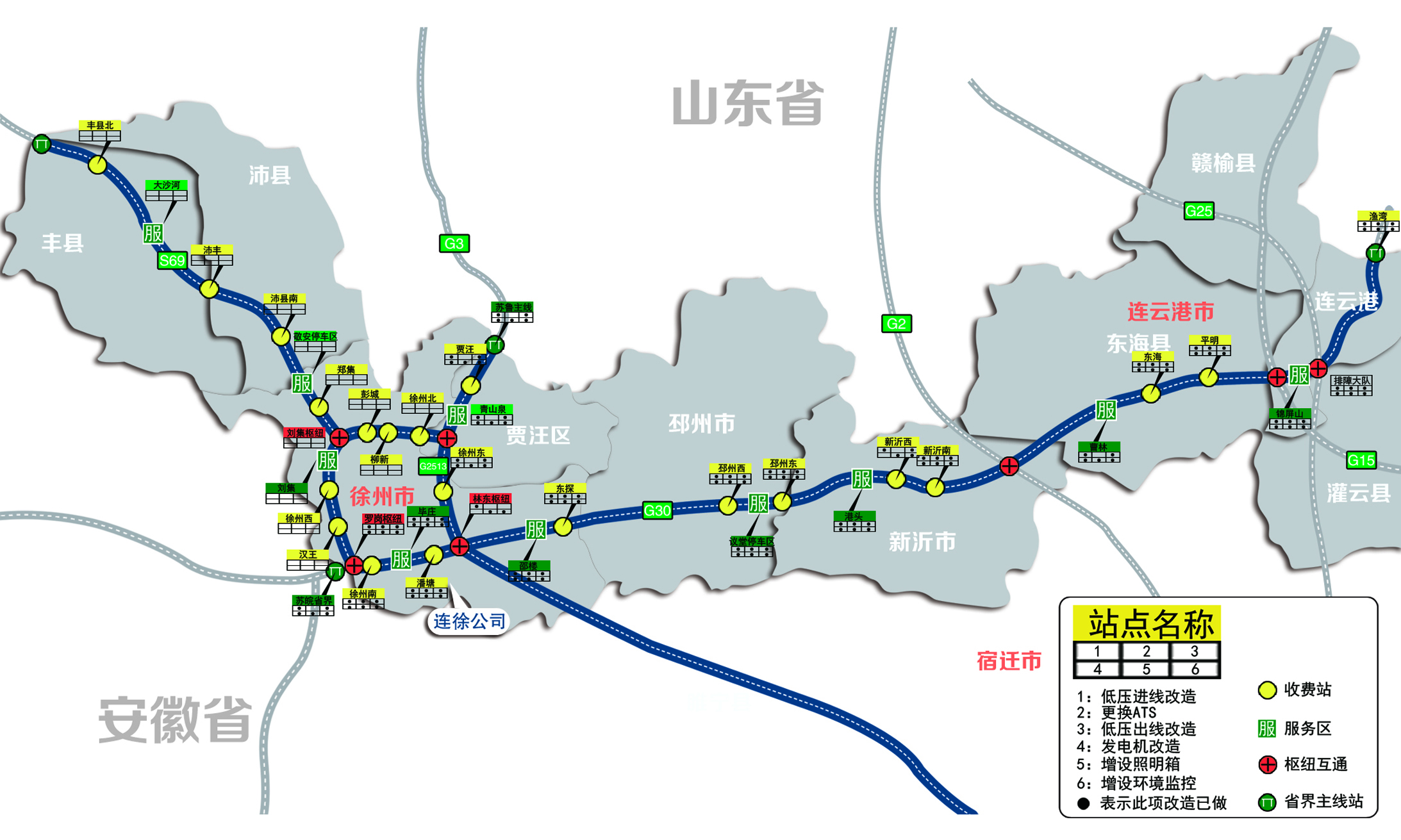 江苏连徐高速公路有限公司管辖S69(徐济高速)、G3江苏段(罗岗枢纽至苏鲁主线站)、G2513(林东枢纽至大黄山枢纽)和G30江苏段(连云港港区至苏皖主线站)四条高速公路。其中:S69(徐济高速) 已设置电力监控系统,涵盖沿线7个无人值班监控子站、1个有人值班监控子站;G3江苏段,汉王收费站至大黄山枢纽段已设置电力监控系统,涵盖沿线6个无人值班监控子站、1个有人值班监控子站;大黄山枢纽至苏鲁主线收费站未设置电力监控系统,沿线共设置3处服务设施;G2513(林东枢纽至大黄山枢纽)未设置电力监控系统,沿线设置1处服务设施;G30江苏段(连云港港区至苏皖主线站)未设置电力监控系统,沿线共设置19处服务设施。